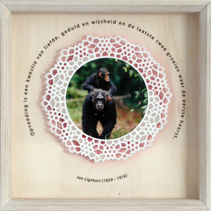 2015Spin-off van het deurposterproject. In opdracht van de Hogeschool Utrecht (HU) heb ik, samen met Erik Jepma een gedeelte van het collagemateriaal dat voor het deurenproject verzameld was omgewerkt tot een serie kunstwerken, bedoeld als unieke 'HU-geschenken' (voor pensionairs, bijzondere gasten etc.). We hebben ervoor gekozen om met het materiaal cassetes in te richten. De cassette moet niet gezien worden als een "lijst", die naderhand bij de collage wordt gezocht maar een (platte) ruimte die met het collagemateriaal wordt ingericht. De omlijsting vormt zo één geheel met het kunstwerk. De hier getoonde cassete is uitgereikt aan Princes Maxima, bij de opening van de nieuwe faculteit. Thema van de collage is een uitspraak van Jan Ligthart, "Opvoeding is een kwestie van liefde, geduld en wijsheid en de laatste twee groeien waar de eerste heerst".